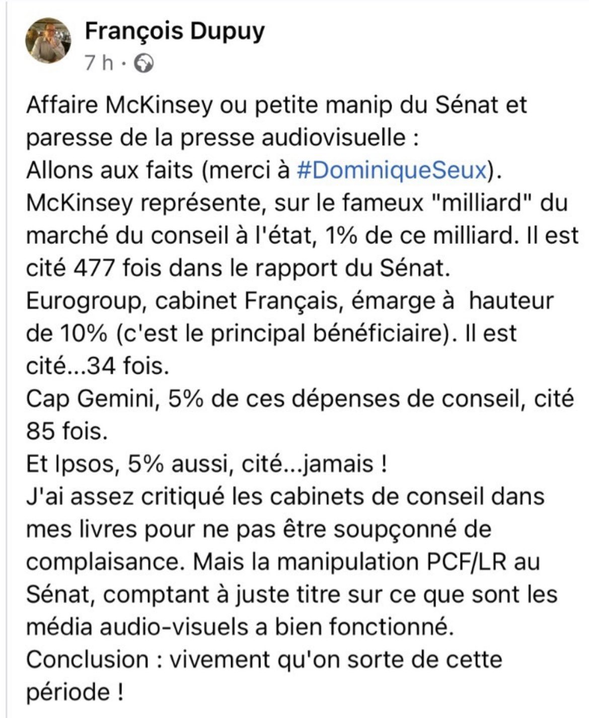 « Ci-joint un avis éclairé de François Dupuy sociologue des organisations auteur de plusieurs ouvrages sur la bureaucratie, le changement et le management, sur le scandale McKinsey. »